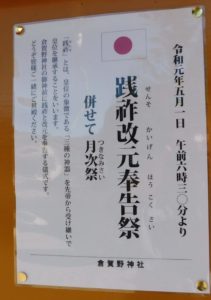 奉祝 令和元年 天皇陛下御即位 投稿日: 2019年5月2日 あめのうずめ 5月1日の早朝、恒例のおついたちの月次祭(つきなみさい)に併せて、「践祚改元奉告祭」がおこなわれました。いつもの月次祭とは異なり、御本殿の御扉(みとびら)を開いて、御神前まぢかに新天皇陛下の御即位と改元のことを奉告いたしました。 践祚改元奉告祭