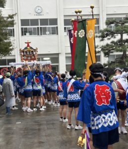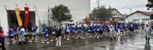 大祭の前日の10月18日には中学生神輿が神社を出発。霧雨のなかにも、地域に元気な掛け声が響き渡りました。